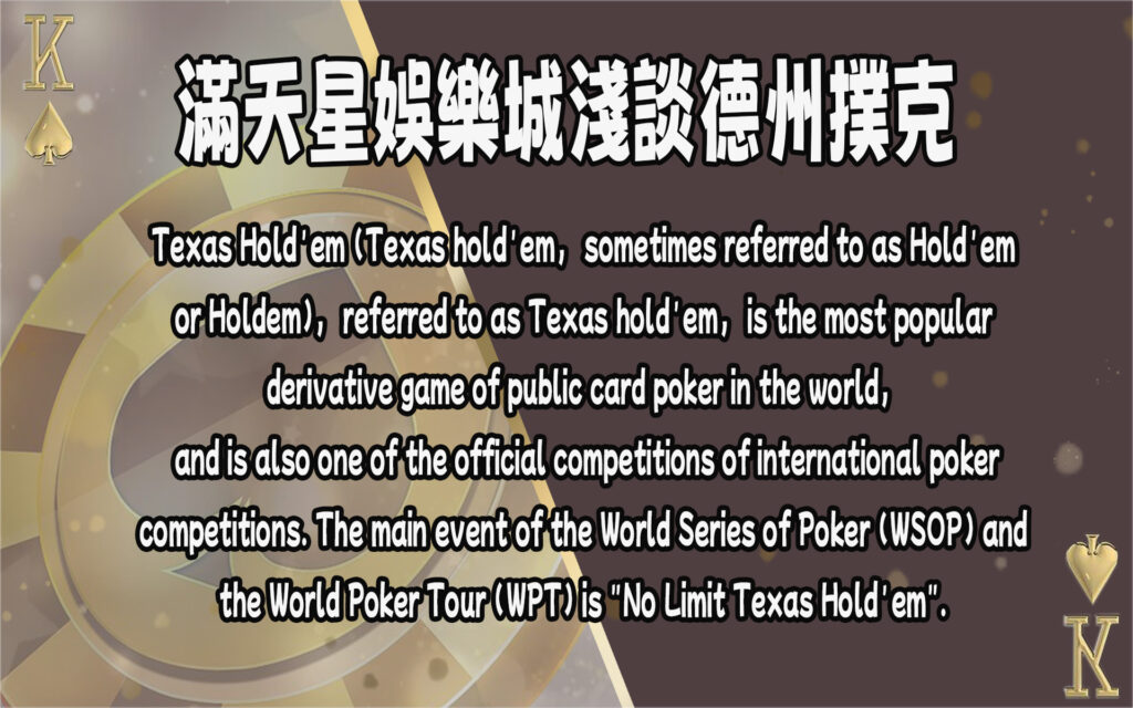 Texas Hold’em (Texas hold’em, sometimes referred to as Hold’em or Holdem), referred to as Texas hold’em, is the most popular derivative game of public card poker in the world, and is also one of the official competitions of international poker competitions. The main event of the World Series of Poker (WSOP) and the World Poker Tour (WPT) is “No Limit Texas Hold’em”. Texas Hold’em is one of the poker derivative games with the greatest influence on position order. The betting order in each round remains the same. It is also the most popular poker game in most casinos in the United States. It is also very popular outside the United States. Bridge is equally popular. Theoretically, a table can accommodate up to 22 players (23 if cards are not sold) at the same time, but usually two to ten people per table.